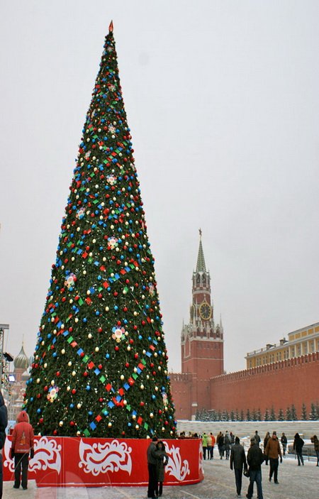 Елку привозят в Москву из владений Деда Мороза – Великого Устюга. Ей уже больше 110 лет, а иголкам на ней не меньше десяти. Украшают ёлку 2 000 игрушек, километр гирлянд и золотисто–красная звезда.