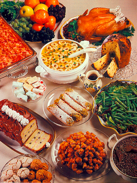 Среди традиционных блюд обязательно на новогоднем столе должны присутствовать домашние капеллетти, трюфеля, копченый лосось, кампоне, индейка, миндальные пирожки, паровая треска или окунь в белом вине, маленькие пельмени — тортеллини с ветчиной пашутто и сливочным соусом.