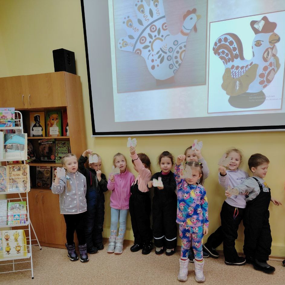 В творческой части занятия одни дети раскрасили петушка в стиле дымковской игрушки, другие сделали аппликацию «Горшочек под хохлому».